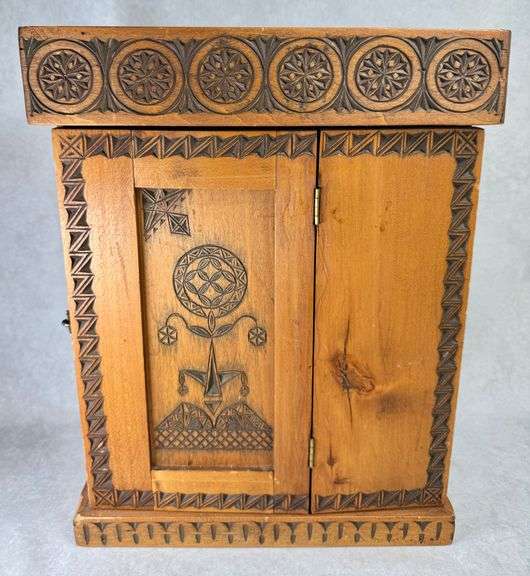Not sure what the symbolism is on this cabinet. Measures 14.25" tall, 11" wide and 5.25" deep. On the bottom left corner, there's an area missing a small piece of wood.