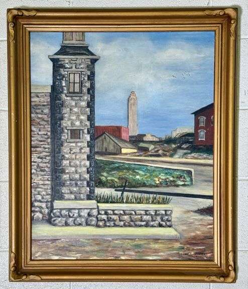 LOT 52 - Original Citadels of Columbus Ohio LeVeque Tower Oil Painting on Board Elenore Hunter
